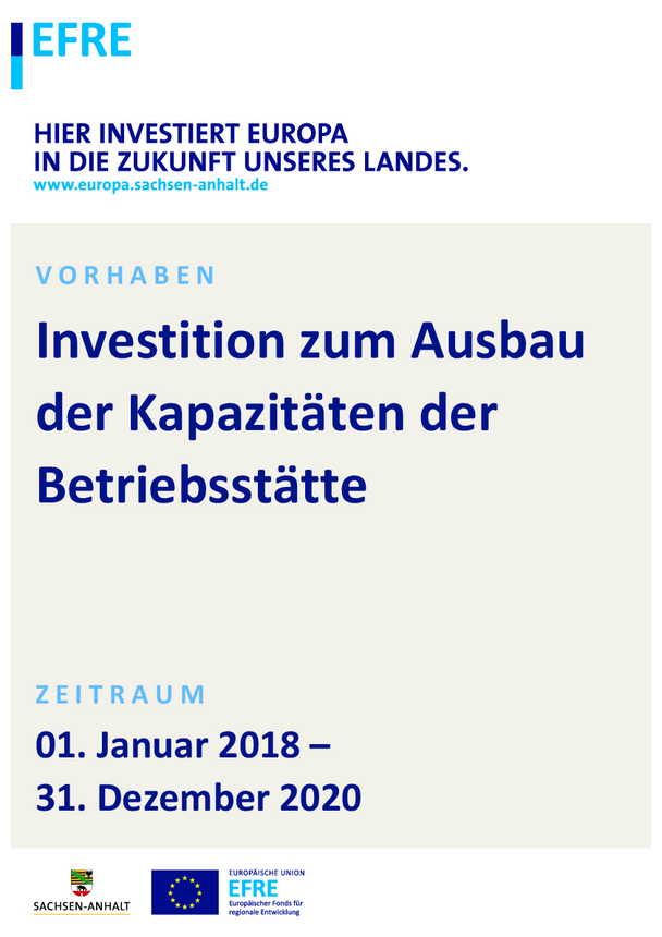 Hierfür erhalten wir eine öffentliche Finanzierungshilfe an die gewerbliche Wirtschaft im Rahmen der Gemeinschaftsaufgabe "Verbesserung der regionalen Wirtschaftsstruktur" (GRW) und Mittel der Europäischen Fonds für regionale Entwicklung / EFRE.
